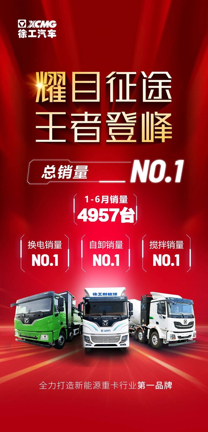 据第一商用车网发布的榜单显示,2024年1-6月,徐工新能源重卡累计销量4957辆,继2023年度累销冠军、2024一季度累销冠军的良好势头,再次荣登2024年半年度新能源重卡销量榜首。
