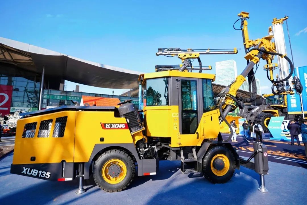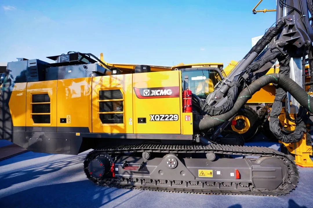 国内最大孔径潜孔钻机徐工XQZ229的亮相也让人大开眼界, 可靠性高、 钻孔速度快、油耗低,钻孔直径152mm~229mm,最大钻孔深度30m , 可满足各种露天矿山的钻孔需求,