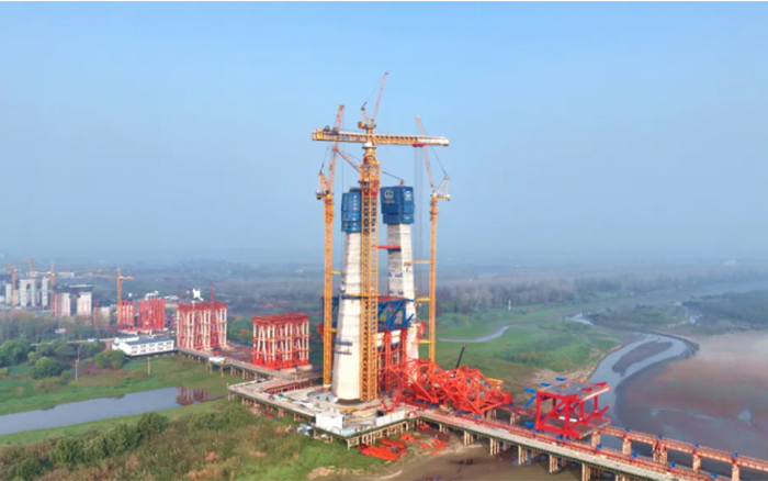 巢马铁路马鞍山长江大桥是世界最大跨度三塔斜拉桥,主塔总高345m。采用XGT15000-600S塔机进行上部钢塔柱施工吊装仅需将钢塔柱划分为13个吊装单元,最大单元重量超550t,较传统施工方式效率提升65%以上。