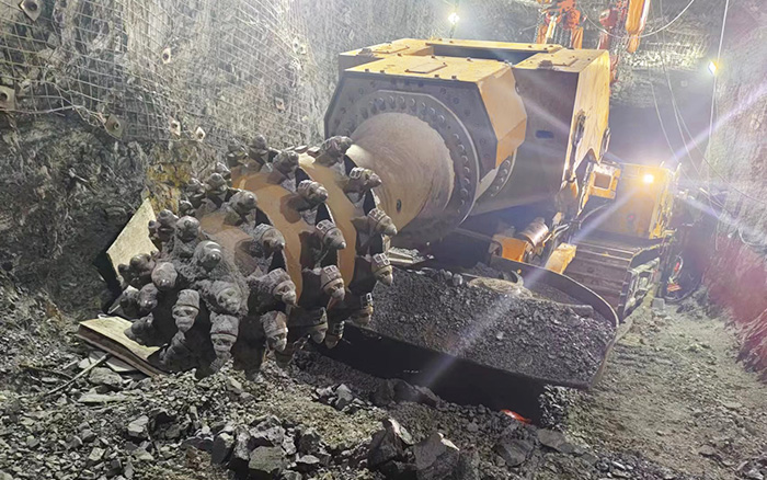 该矿施工断面5m*4.5m,岩层硬度在60MPa左右,客户所选购的徐工XTR7/360掘进机最大截割高度7.2m,可实现中等断面隧道一次开挖成型,切割头配合硬岩截齿,掘进时可以向岩壁施加每平方厘米1.5吨的力量,在机动灵活的基础上兼具掘进硬岩的优势。