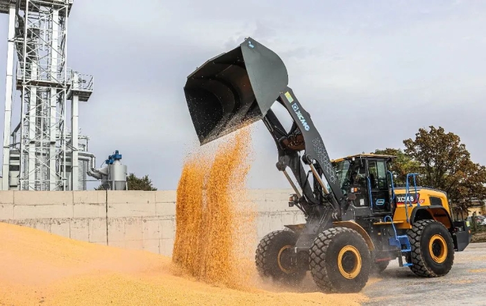 眼下,在欧洲某农产品加工厂,徐工XC968-EV纯电动装载机正迅速挥动大臂,翻动室外晾晒的谷物。