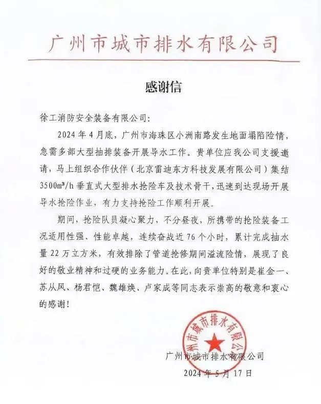 近日,徐工消防收到一封来自广州市城市排水有限公司的感谢信,信中热忱感谢徐工在广州市海珠区某地地面坍塌险情中提供的高效、专业的设备及人员支持。