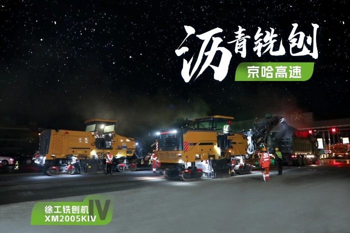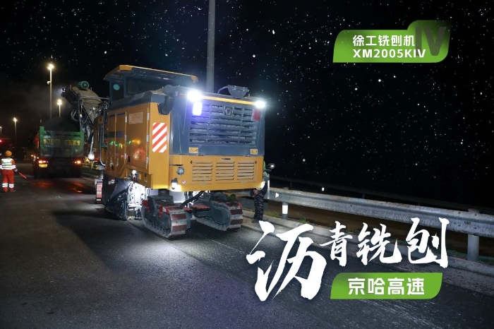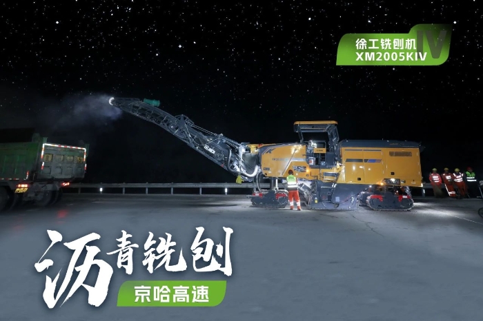 此次施工项目为京哈高速的路面改扩建工程,铣刨深度5cm,铣刨速度25m/min。由于北京地区日间车流量大,交通压力较大,因此施工方选择在夜间施工,日间恢复行车,尽量避免施工给交通带来影响。由于夜间施工更加考验施工设备的稳定性、施工质量的可靠性,施工方选择了两台徐工两米铣刨机作为本次高速公路养护工程的铣刨设备,分别为XM2005KIV和XM200KII,同时进行铣刨作业,并肩作战,按下施工进度快进键。
