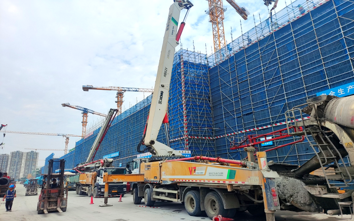 施工现场,臂架林立、机器运转,徐工成套混凝土机械联袂出击,新能源搅拌车、车载泵、泵车齐上阵,从混凝土运输、泵送施工、服务保障等方面守护项目顺利进行。