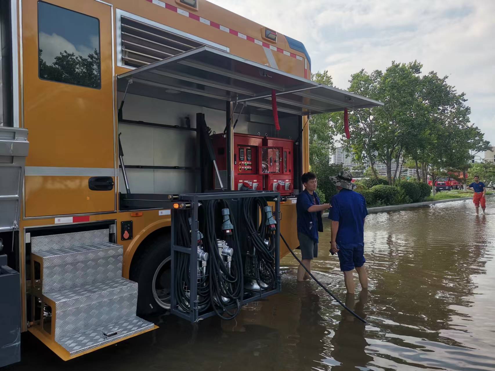 7月中旬,河南省普降大到暴雨,降雨时间长、强度大、影响广,多市发布暴雨Ⅰ级预警,人民生命财产安全面临巨大威胁。接到有关单位紧急通知后,徐工迅速集结车辆人员,出动PS40B泵组式排水抢险车,携带足量随车器材,连夜动身前往河南商丘,火速开展救援。