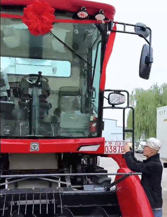 提车现场,礼花鞭炮齐鸣,身披大红花的玉米收获机整齐排列,一台接一台奔赴田间地头,即将逐梦沃野,绘就丰收图景。