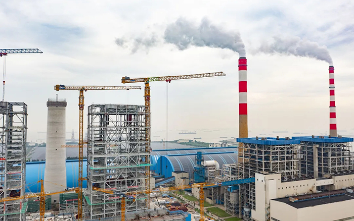 侧望长江畔,机器轰鸣、江水潺潺,华能太仓电厂机组扩建项目施工现场一派繁忙景象,XGT3100-160S、XGT1350-64S两台徐工超大塔稳稳矗立在高耸的钢架间吊装作业。