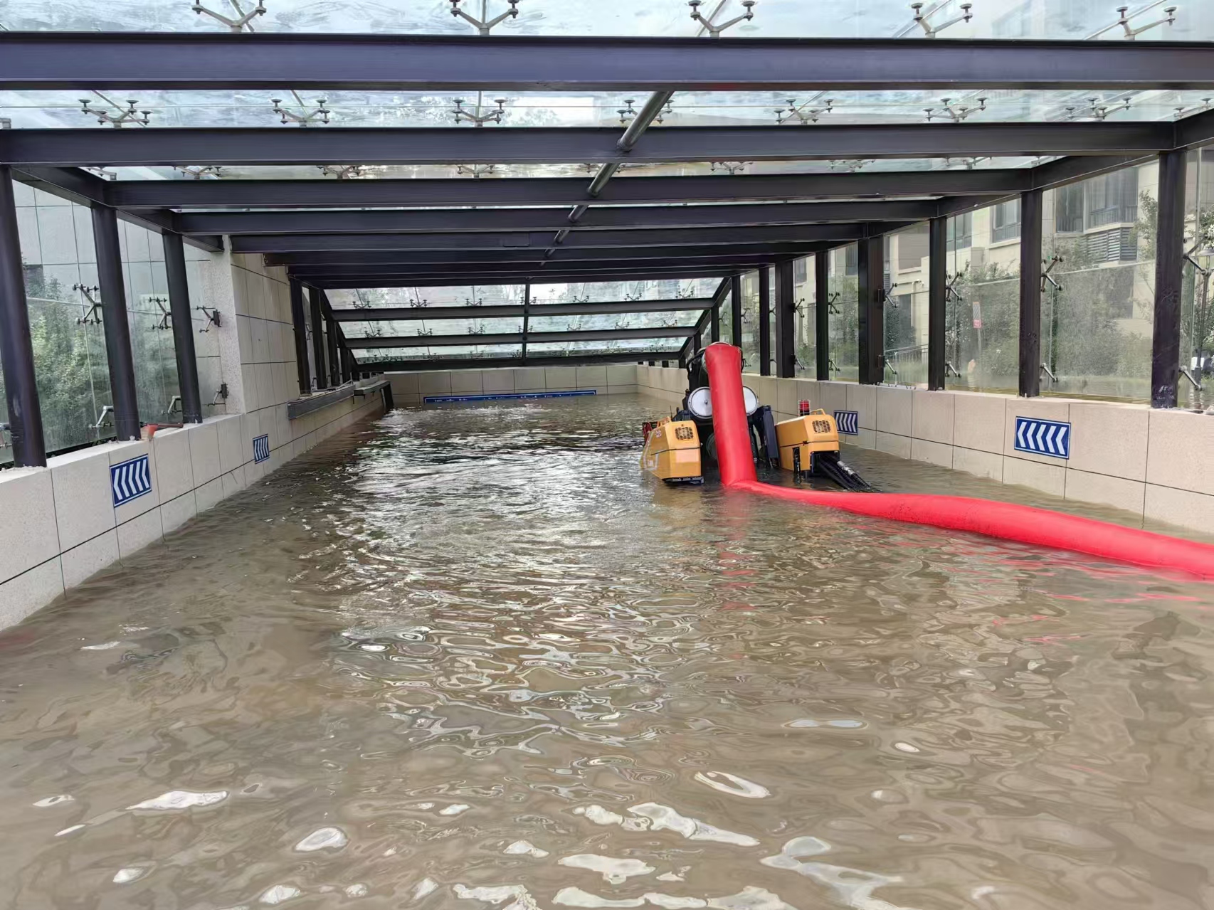 闽泰小区位于萧县龙河街道交通东路,暴雨导致小区变身“水帘洞”,路面积水已没人员小腿,迎街地下车库积水倒灌,出入口已被完全淹没,近百台车辆无法转移,受损严重。由于车库平均宽度仅2.5m,大型救援车辆进出受阻,紧急之际,徐工调派PS50F子母式排涝车赶往支援。