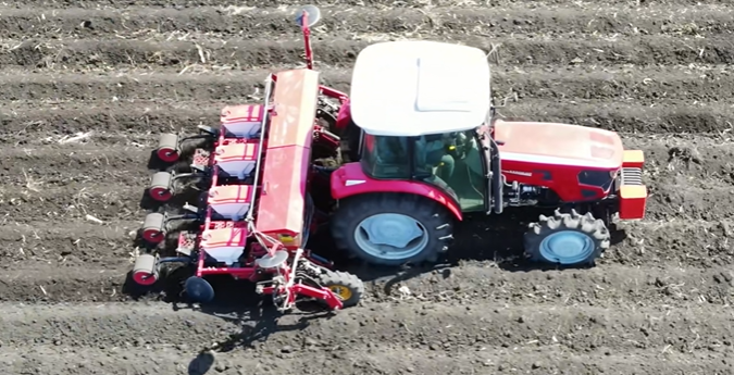 播种机作业,四行播种,作业速度为8km/h。