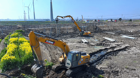 在扬州178兆瓦光伏施工现场,徐工XE300GP打桩机正演绎着现代工程机械的超强实力——机械臂精准起落间,10米预制桩以平均57s/根的节奏植入地层,桩基垂直度监测仪实时显示±5厘米的精度数据。