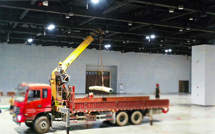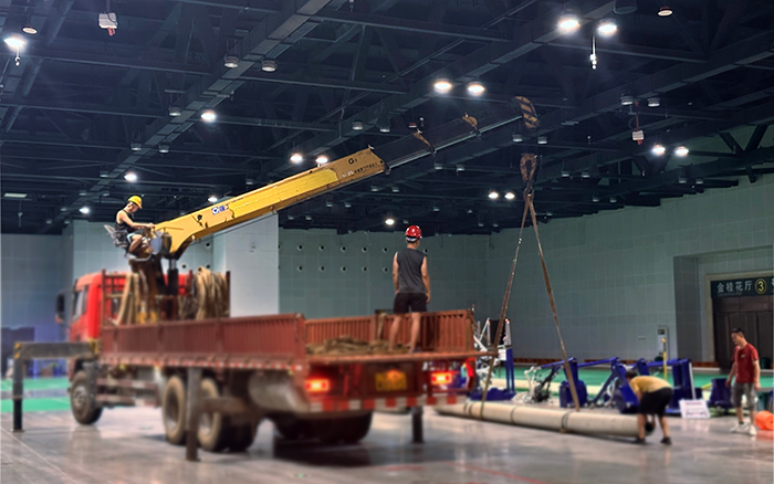 在广西国际会展中心体育场馆塑胶铺设施工现场,徐工随车起重机以硬核实力成为工程推进的 “主力军”,赢得客户连连称赞。