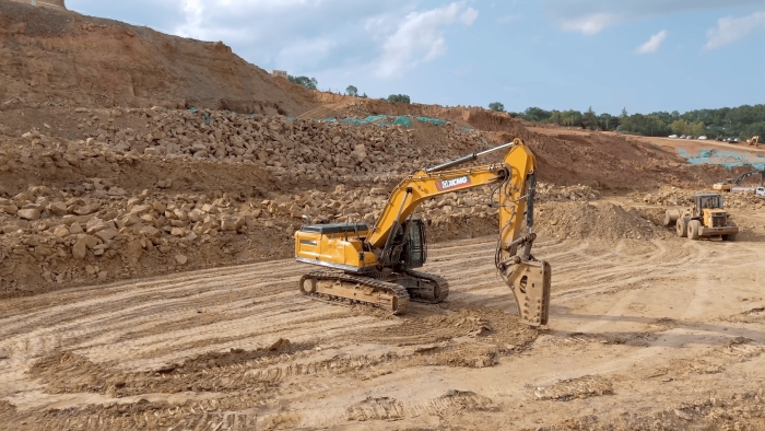 徐工挖掘机打破碎很有劲,驾驶舒适。我们在这个项目上主要做巨石破碎工作,徐工的设备在回转、破碎等动作上都表现的很优秀,属具更换很便捷,底盘比其他品牌的同吨位设备都要稳。