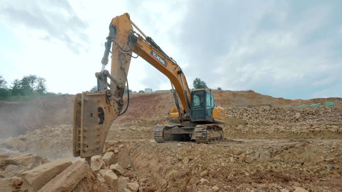 该设备搭载的低速大扭矩发动机与大排量主泵协同发力,15100J的超大冲击力轻松解体围岩巨石,破碎后的骨料直接用于站区围挡浇筑填充,实现资源闭环利用。