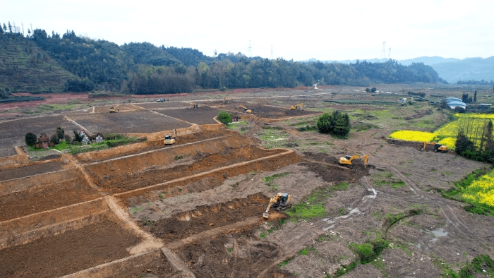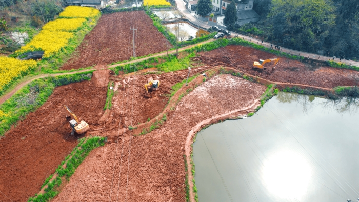 继续向东,这里是万里长江第一城——宜宾,在宜宾江安县阳春镇,5000亩高标准农田建设进入尾声,项目高峰期投入30余台徐工挖掘机。