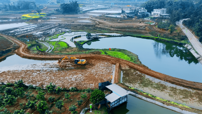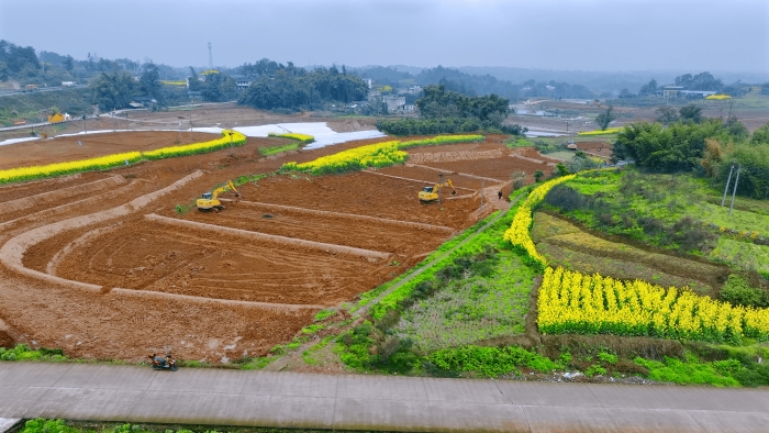 洪雅向东90公里,是仁寿县,作为四川省产粮大县,仁寿曾因田块细碎导致机械化率不足。在5000亩的高标准农田建设中,项目方集结18台徐工挖掘机,以“日均30多亩”的速度抢抓工期。