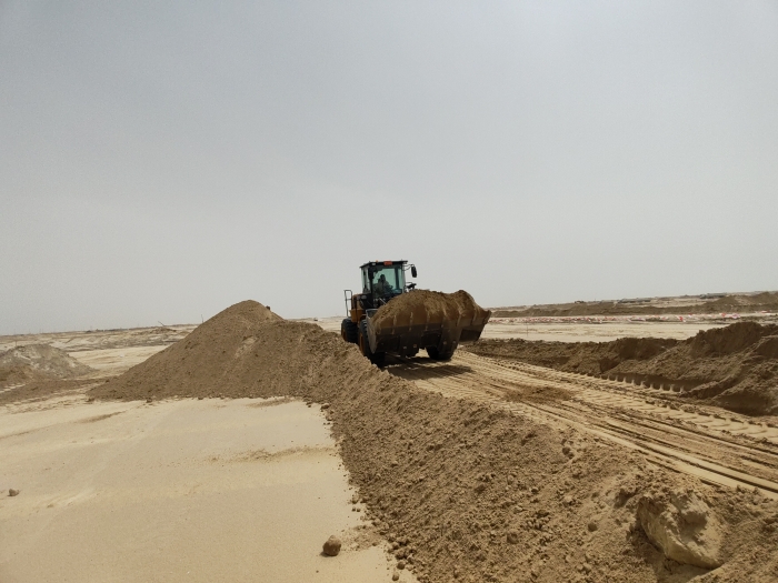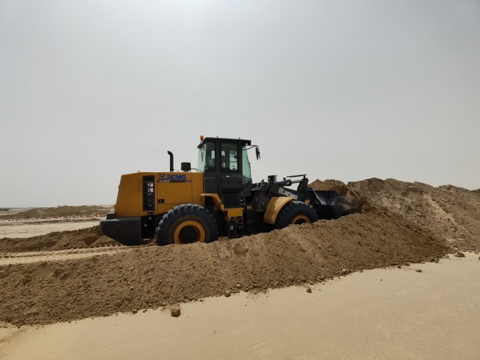 当地金光闪耀的沙漠地带是极具标志性的景观,数台徐工ZL50GN装载机正在其中紧张作业。担负起土方搬运、路基平整、材料装卸等关键任务,在高温、多尘的恶劣环境下依然表现出众,成为不可或缺的重要力量。