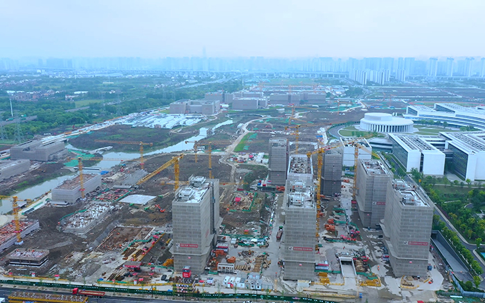 西湖大学云谷校区正一片火热,高耸的徐工群塔正挥舞长臂、紧张施工,与远处的青山绿水交相辉映,尽情展现力与美的结合。