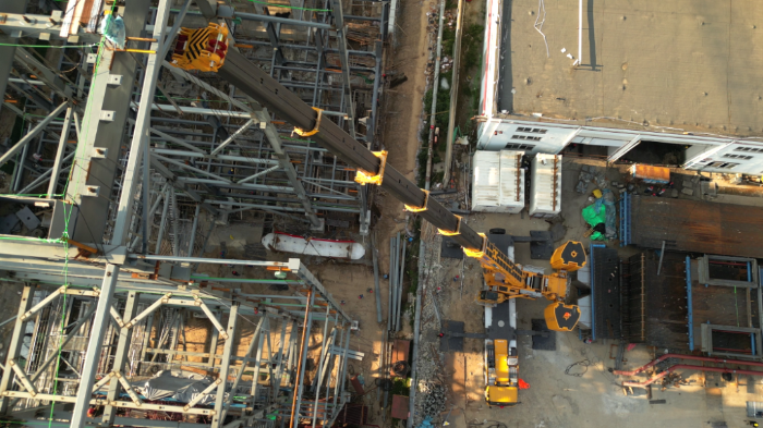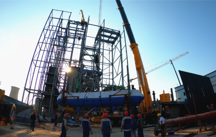 由于场地狭窄,障碍物环绕,集气包还需精准送入已建车间内部,车间上方同样阻碍重重,给施工增加了难度。