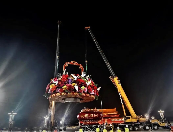 这已是徐工连续第十五年参与天安门国庆花篮吊装任务。9月22日凌晨,两台徐工200吨级汽车起重机协同作业,将重达60吨的篮盘平稳起吊,与16米高的篮体实现毫米级精准对接。
