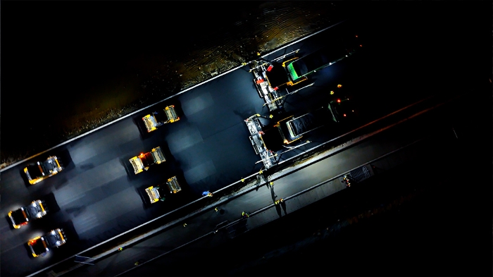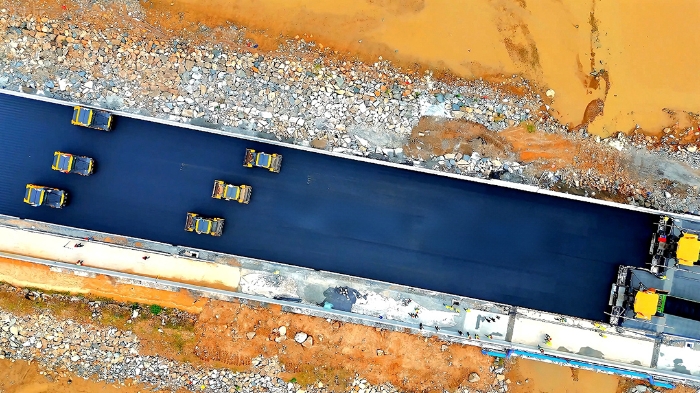 施工中,徐工依托多元感知技术实现工况实时监测,智能决策系统动态调配资源,精准控制技术保障摊铺压实毫米级精度。无人驾驶摊压设备、智能压实,协同作业,24 小时连续施工无间断,较传统模式效率提升25%,能耗降低15%。