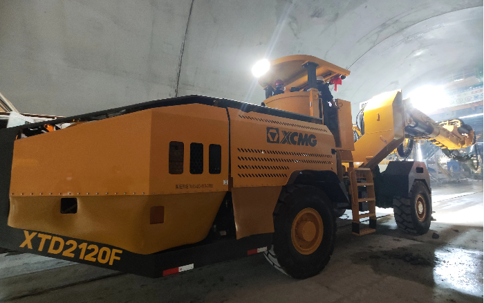 徐工XTD2120F凿岩台车搭载徐工自制凿岩机,配合精准定位系统,在复杂施工环境下,精准定位,高效成孔,单孔2分钟即可成孔,超欠挖率显著降低,契合项目对施工效率与质量的双重需求——