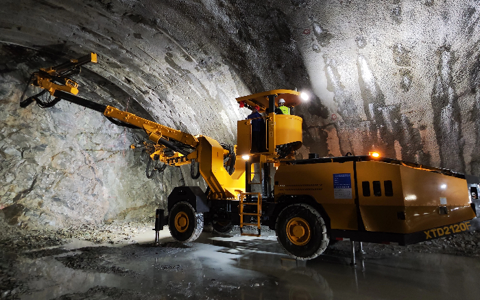 徐工XTD2120F凿岩台车凭借先进的电液控制,实现多臂协同、精准钻进,大幅降低人工作业风险,全力保障项目高效推进。