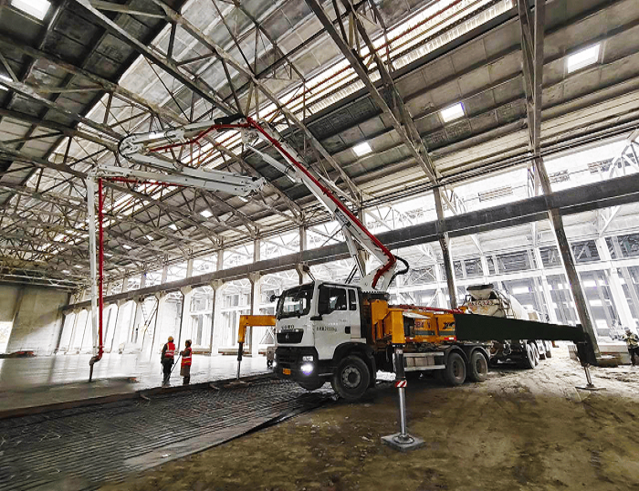 HB43V泵车搭载五节“RZ”型折叠布料杆,370°灵活旋转无施工死角,凭借高效泵送能力适配大面积地坪连续浇筑需求,精准满足C30混凝土强度与平整度标准。