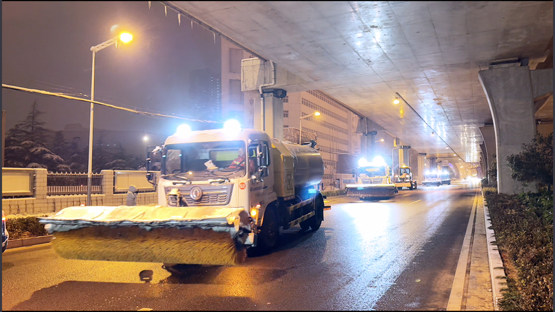 1月20日0点,徐工除雪设备和救援队在徐州东三环快速路集结,对整条三环高架道路除雪,保障清晨的正常通行。