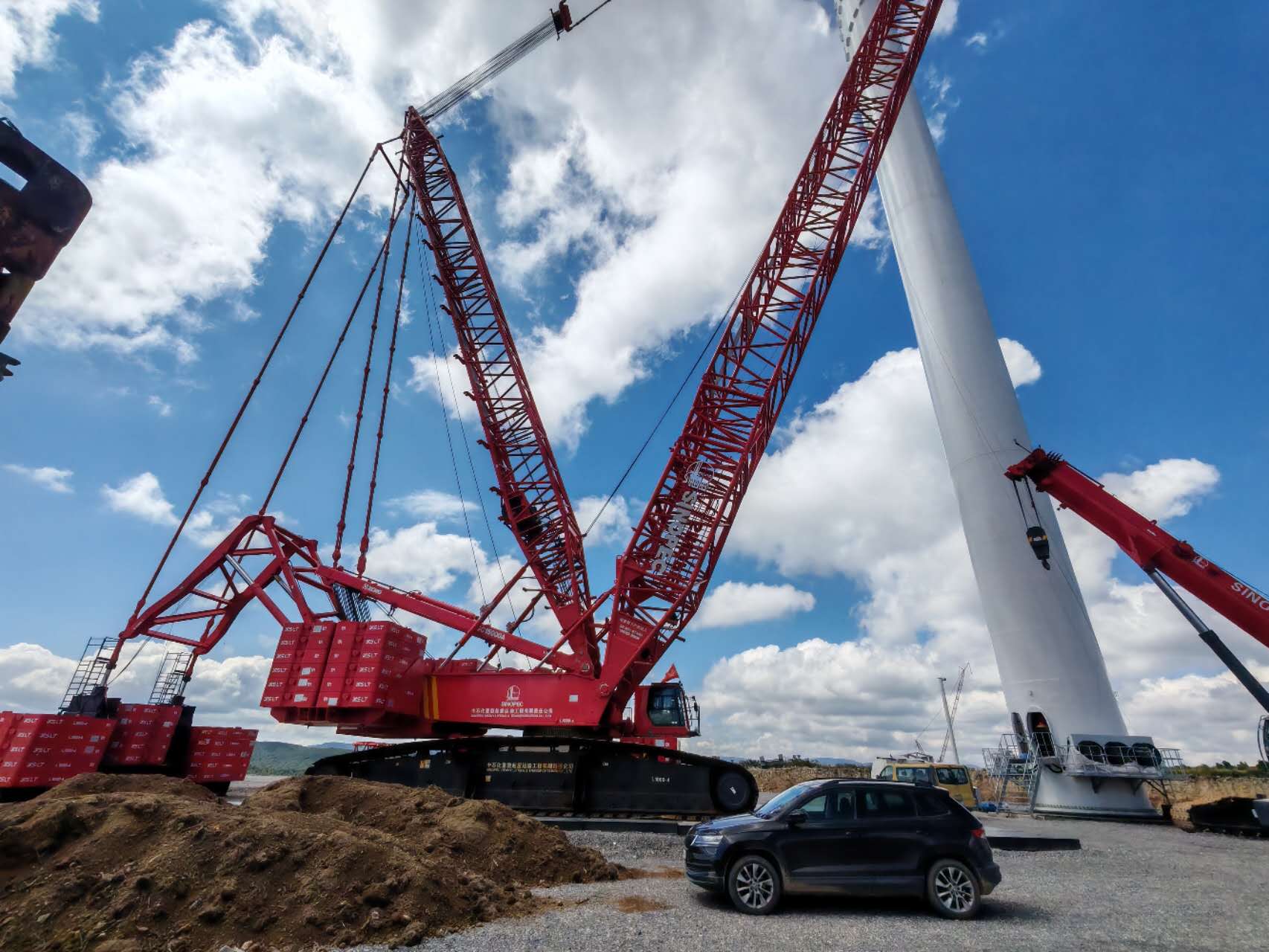该设备凭借其强大的动力系统、灵活的履带行走机构以及先进的智能控制系统,在起伏不平的施工场地中稳定移栽、精准定位,全程护航总计25台大容量风电机组的吊装任务,确保了工程进度按计划推进。