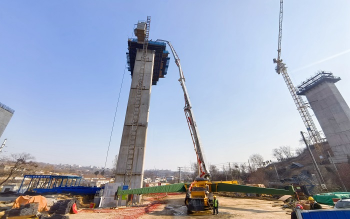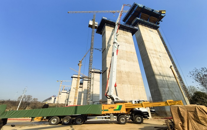 随着项目建设进入关键阶段,密集的桥墩与不断攀升的作业面,让传统泵车望而却步——臂展有限、动力疲软、高空臂架易晃动,成为制约工程进度的难点。