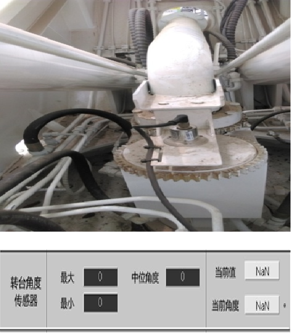 1.故障现象:臂架在正前方,转台对中指示灯不亮,显示器出现转台未对中报警。