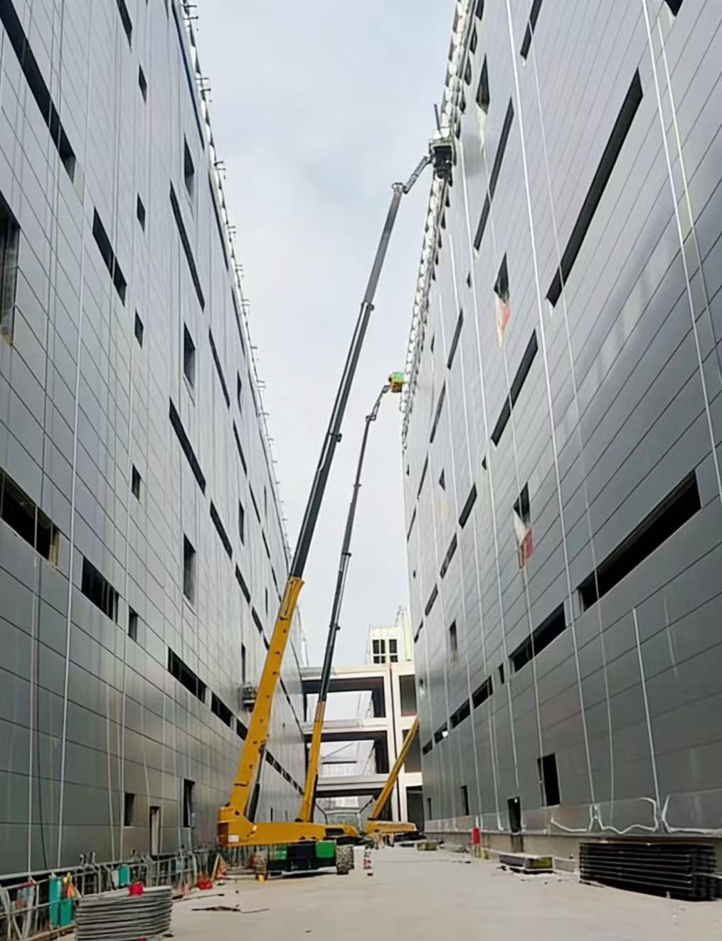 面对这场“高空攻坚战”,徐工多台XGS58K与XGS52ACK-Li高米数直臂式高空作业平台组成“钢铁舰队”震撼登场。58米的极限作业高度轻松覆盖物流仓库外立面钢结构安装、幕墙铺设及机电系统施工的每一处高点;而搭载锂电池系统的XGS52ACK-Li则以零排放、低噪音的绿色优势,在密闭空间和夜间施工中游刃有余,实现了续航长、能耗省、环保达标的完美平衡。设备凭借灵活的臂架设计和精准的微动性能,在纵横交错的钢构之间自如伸展,助力建设者如同“搭积木”般高效完成高空作业。